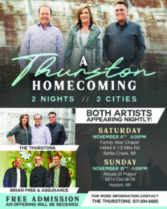 We have several more services scheduled for the rest of October, November and one weekend in December. We hope you can join us at one of these upcoming scheduled events. I do want to make a big deal about our Homecoming Weekend coming up on November 9th & 10th. This is a 2 City – 2 Night Event as we are celebrating our 20th Year in Ministry and sharing the good news of the Gospel in song. Not only will The Thurstons be part of these special nights, but our long time friends Brian Free & Assurance will be joining us. (See the attachment for more information). The concerts will be held at the following locations, dates and times.